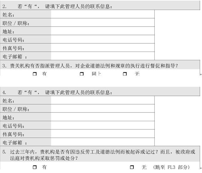 以下從FL4 到FL11, 著重了解“問題2”中,勞工和道德管理的各項規章。從FL12 到FL13, 著重于了解貴機構的管理系統。