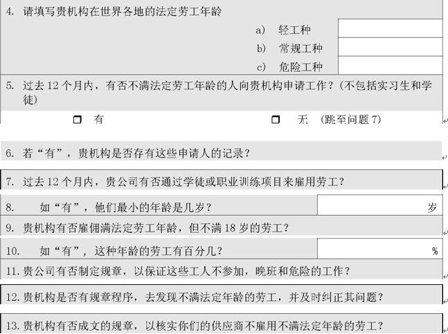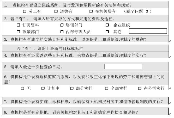 2. 請填入以下包括在貴公司的勞工和道德文件內的各點:勞工□ 自由挑選職業(如:無強制使用,無抵押束縛,不自愿的勞工或監犯勞工)□ 不征用童工 (如:無未滿法定年齡勞工,青少年勞工不參加危險作業) □ 不歧視 (如:年齡,種族,性別,宗教,性和政治傾向等) □ 人道待遇 (如:無凌辱,無強迫,無性騷擾或刑罰) □ 法定最低限度工資 (如:法定工資,超時工資等都清楚講明)□ 工時制度 (如:有最長工作時間限度制,有強制性工休日) □ 自由組織社團 (如:工會,集體議價,公開對話) 道德□ 經營道德(如:無貪圬,賄賂,敲詐勒索,盜用或弄虛作假)□ 信息公開 (如:生意活動,結構,財政狀況) □ 不正當取利(如:不以賄賂或其它不良手段而取利) □ 公道營業 (如:廣告和競爭,保護客戶信息) □ 身份保密(如:工人可以匿名報告違章活動) □ 知識產業 (如:保護合作伙伴的知識財產權)