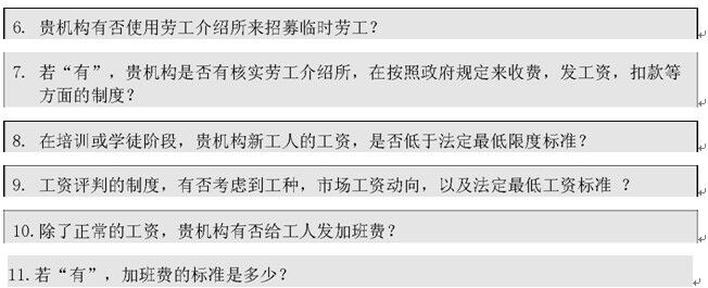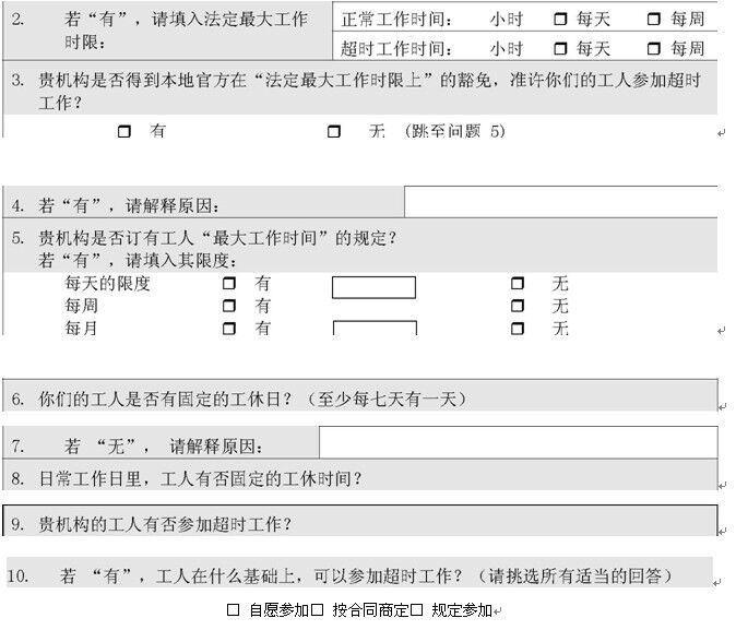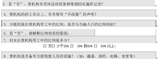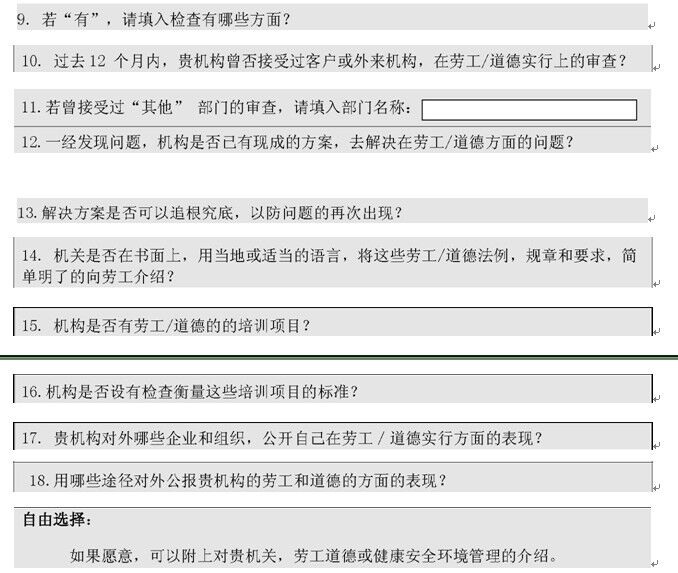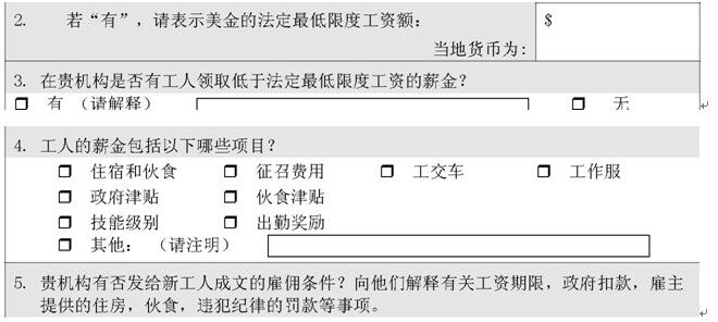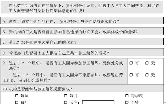 3. 貴機構的勞工和道德制度文件,是否已用不同的語言,向當地勞工宣傳清楚?勞工□ 自由挑選職業□ 有□ 無□ 不征用童工□ 有□ 無□ 不歧視□ 有□ 無□ 人道的待遇□ 有□ 無□ 法定最低限度工資□ 有□ 無□ 工時□ 有□ 無□ 自由組織社團□ 有□ 無